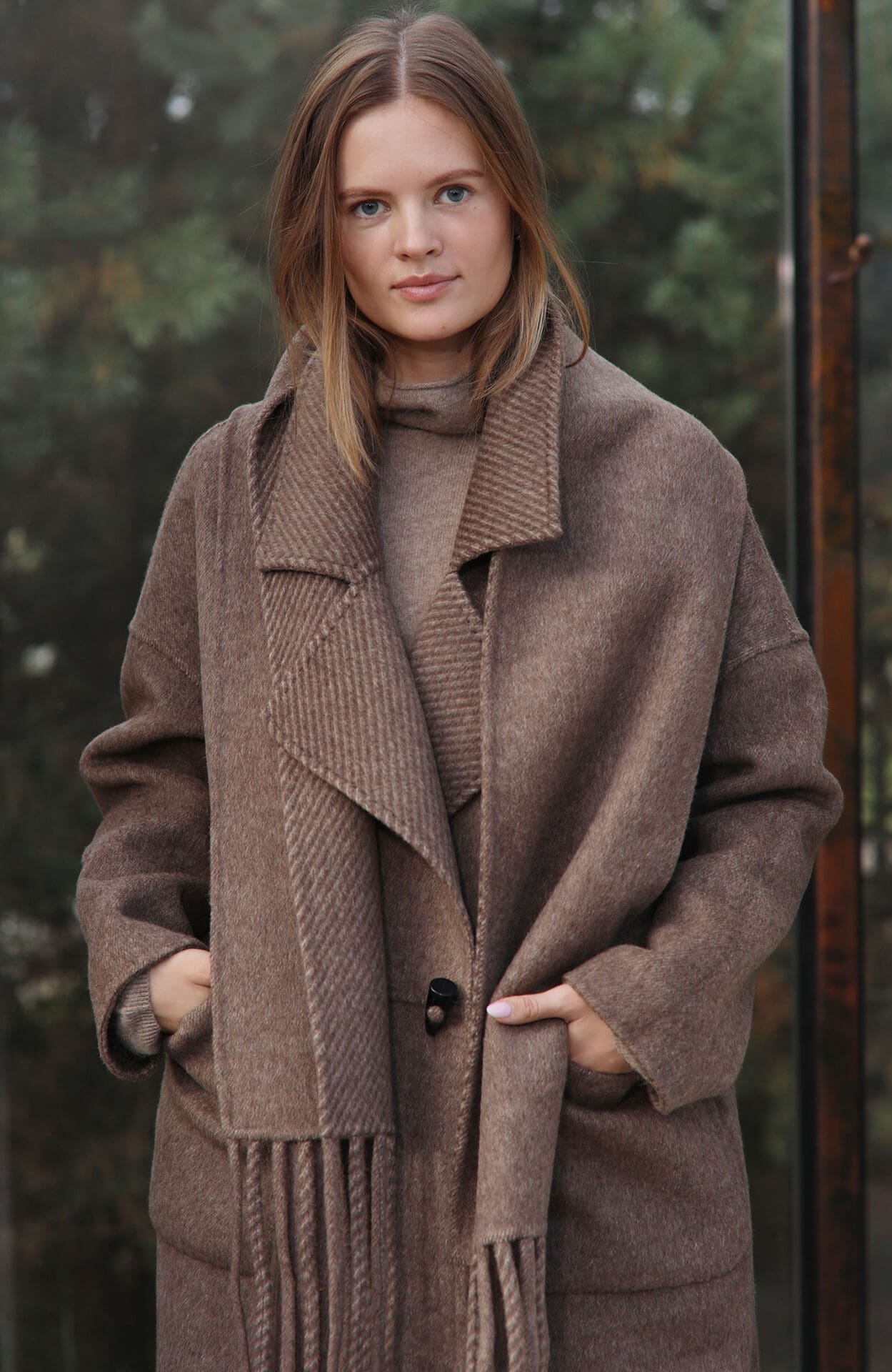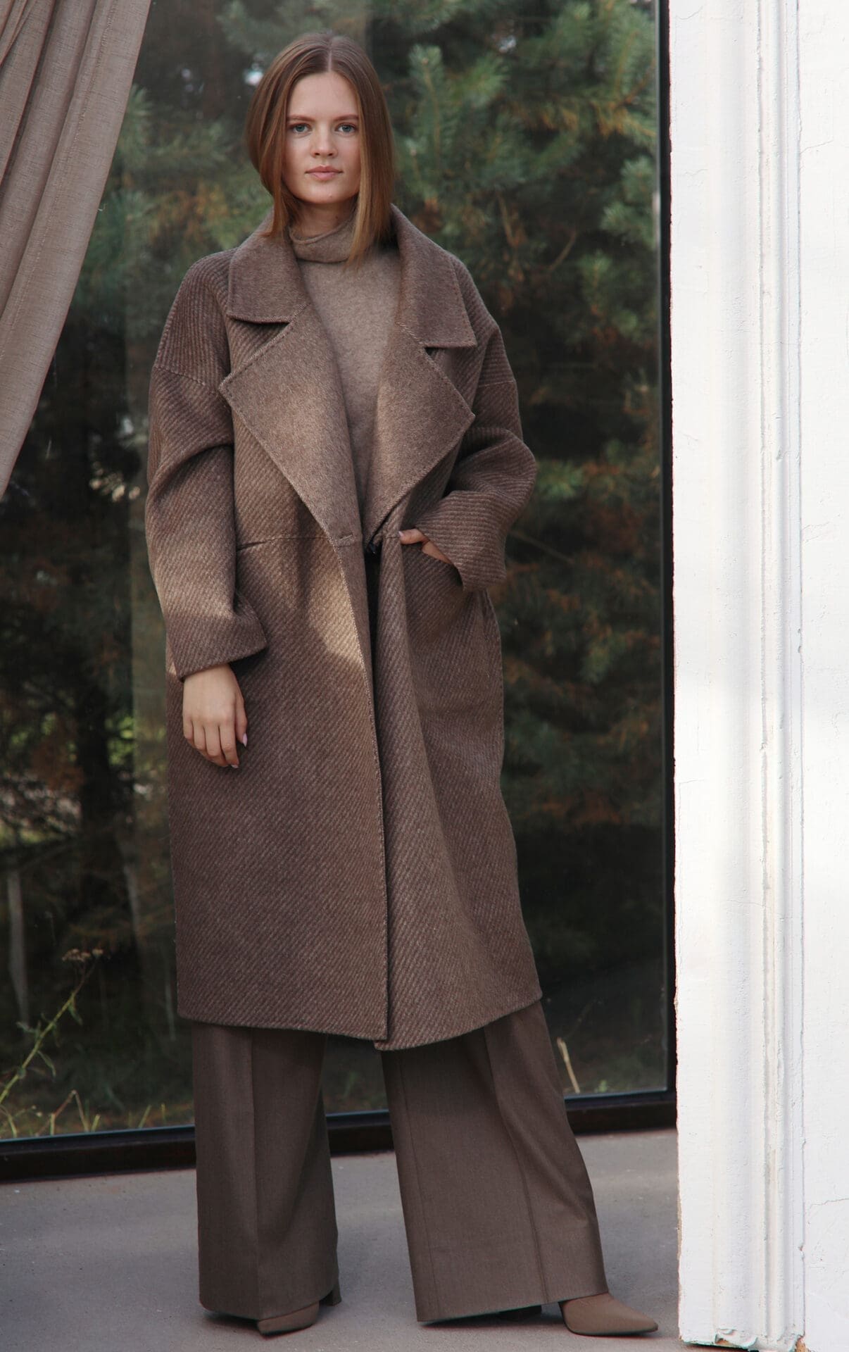 Šis tiesaus silueto dvipusis itin kokybiškas paltas,Jį galima dėvėti keliomis variacijomis, vis įgaunant skirtingą įvaizdį. Viena pusė lygesnio audinio, kita ruoželinės diejų spalvų struktūros. Turi kišenes bei užsegima saga. Dėvimas su dideliu masyviu šaliku. Itin prabangus ir stilingas pasirinkimas.