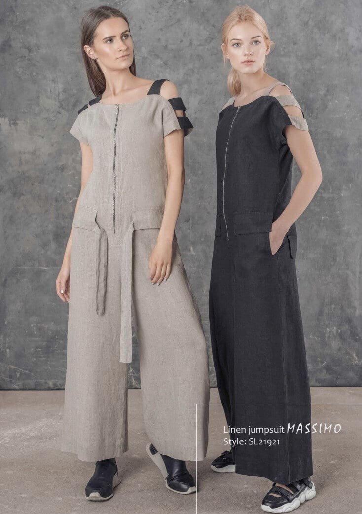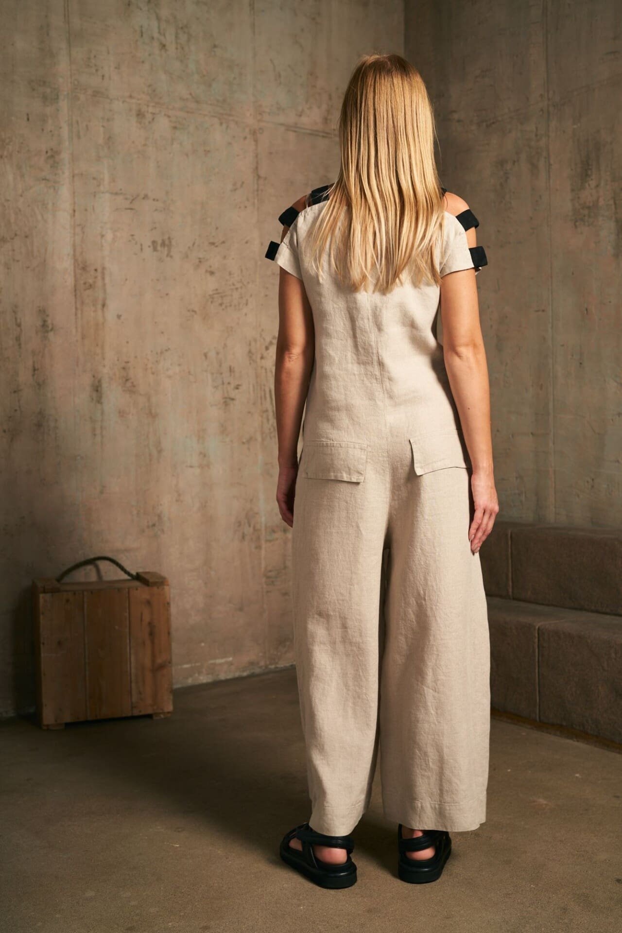 Tiesaus silueto su akcentuojama pečių detale moteriškas kombinezonas