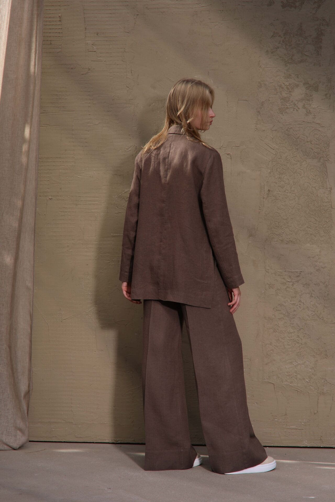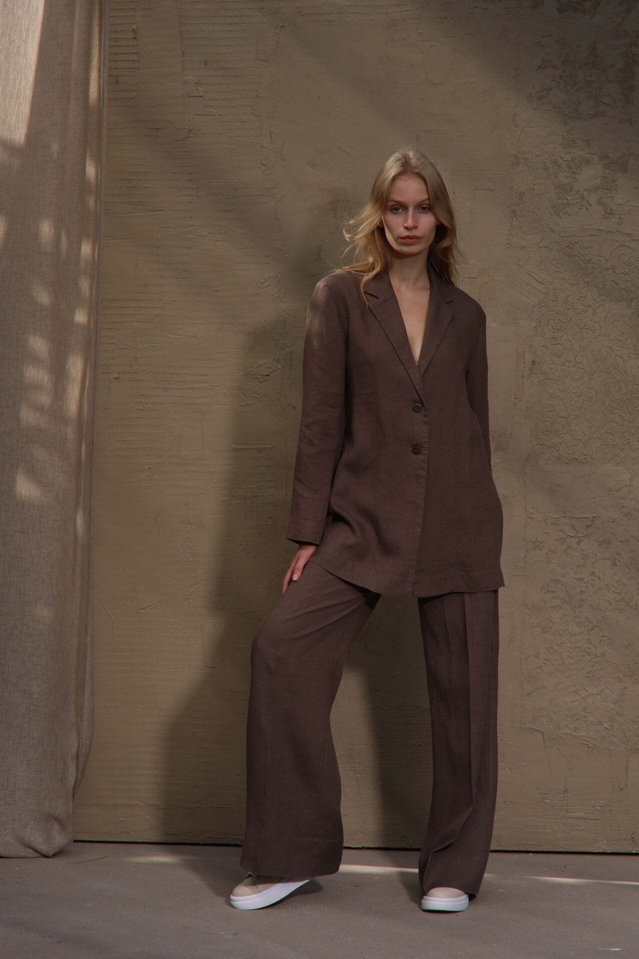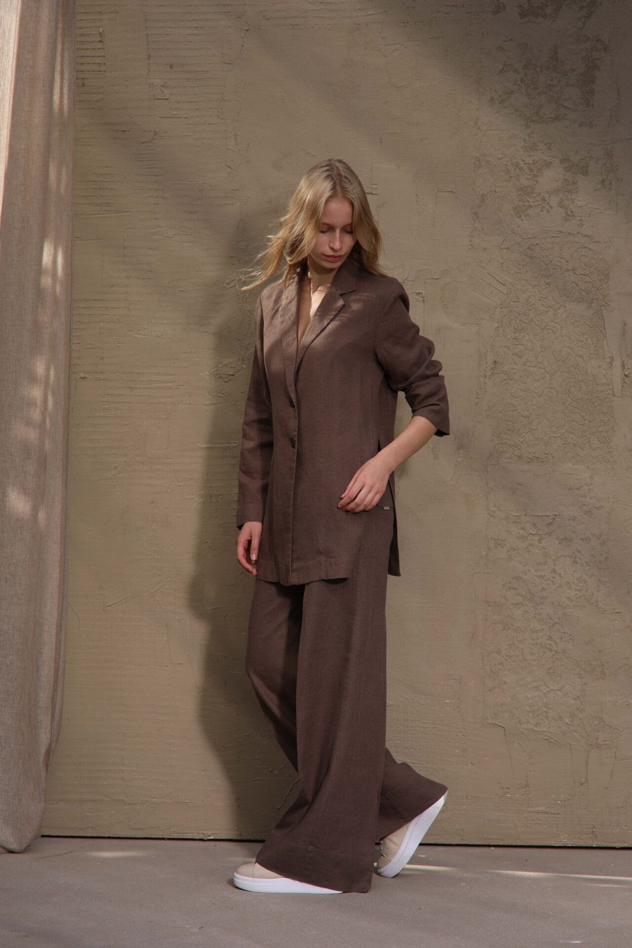 Thanks to its minimalist design, this linen blazer is easy to style with various wardrobe pieces. Pair it with tailored trousers, denim, skirts, or dresses to create a modern Scandinavian-inspired outfit.