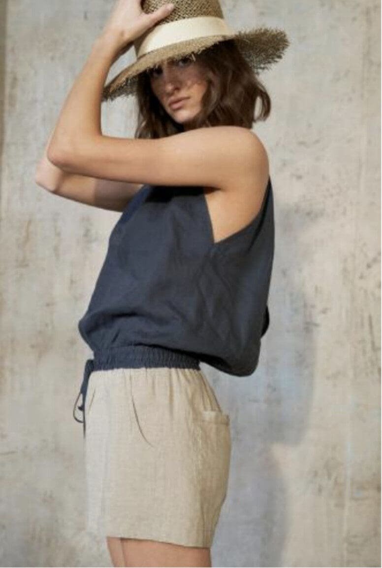 Trumpas 100% lino kombinezonas su akcentuojama nugaroje lengvai surišama detale, fiksuotos gumos liemens linija ir kišenėmis.