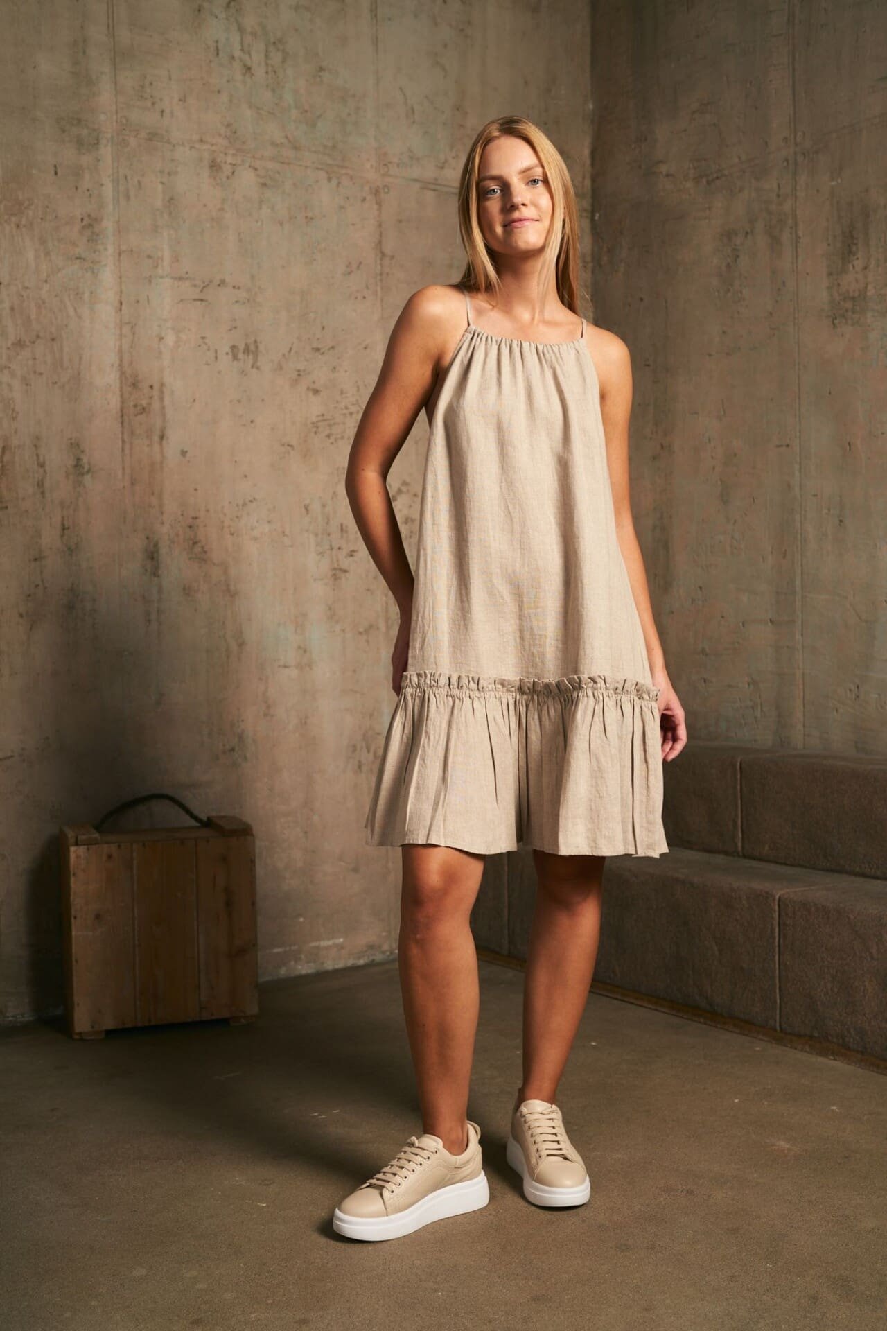 Highly flared short linen dress. The length of the dress is adjustable with a tie at the back.
