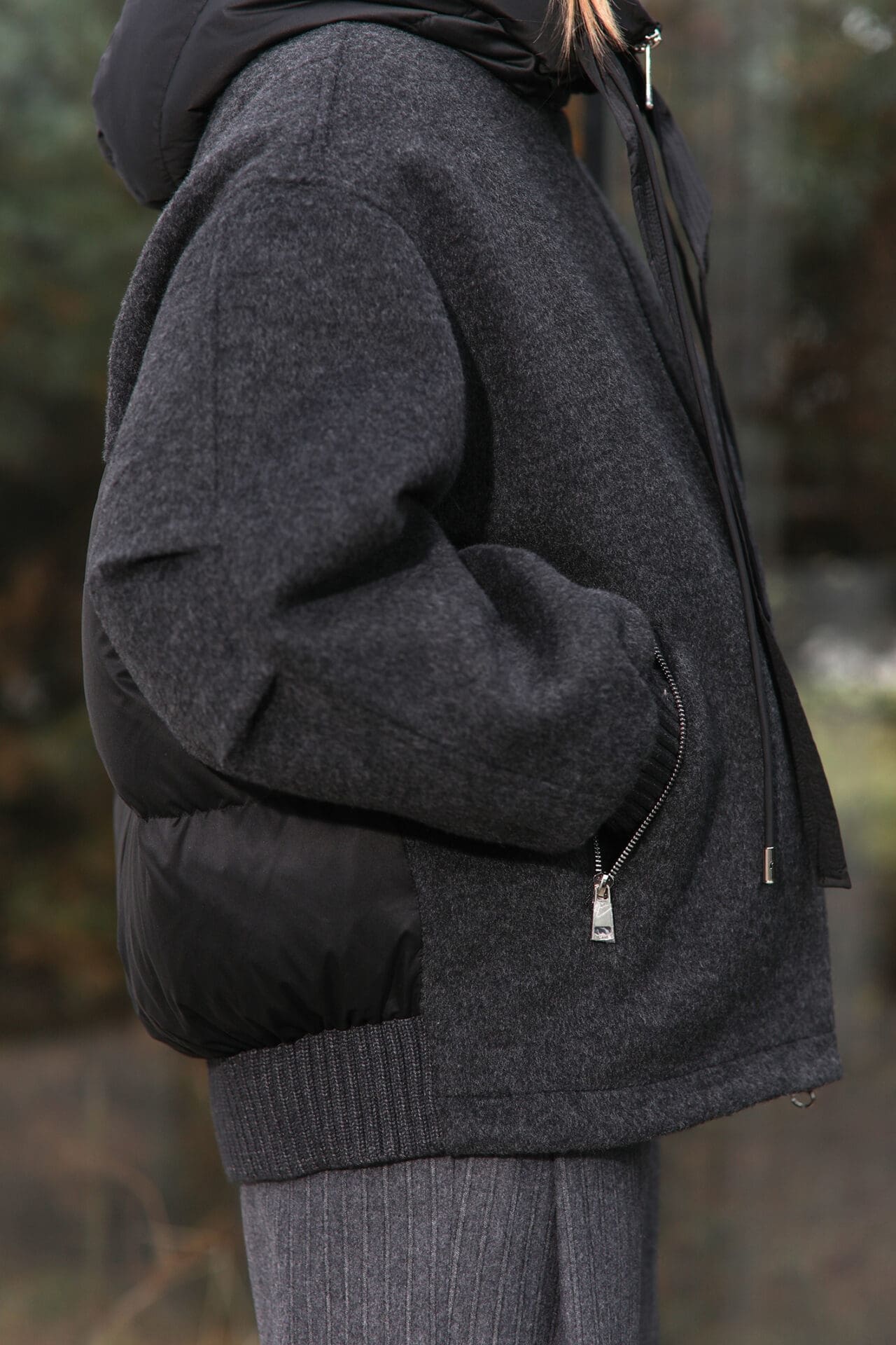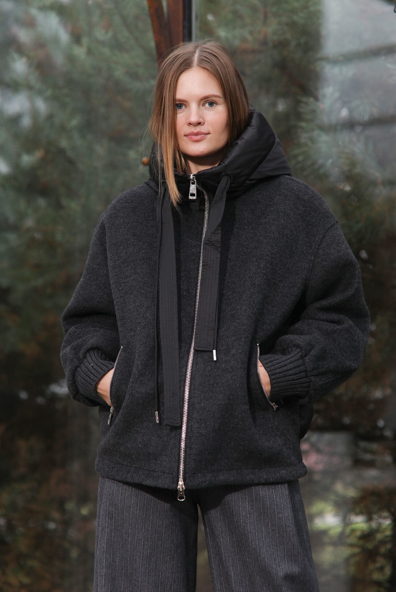 Labai modernus, minimalistinis, šiek tiek „urban“ bei „luxury casual“ įvaizdis. Plati, laisvai krentanti, oversize tipo striukė-paltas, suteikianti komfortišką ir lengvai sluoksniuojamą siluetą. Pagrindinė dalis vilnos tipo audinio, suteikiančio paltišką, struktūruotą įvaizdį, o nugarinė dalis ir kapišonas – iš pūstos, paminkštintos medžiagos, panašios į puffer tipo striukes. Tai sukuria kontrastą tarp tekstūrų ir suteikia papildomos šilumos.