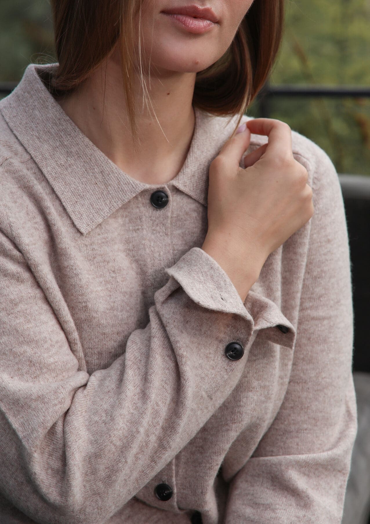 Kašmyro megztinis, su dekoratyve akcentine detale rankogaliuose. Kasikinio tipo, susagstomas sagutėmis – saugus, šiltas ir stilingas pasirinkimas kasdienai.
