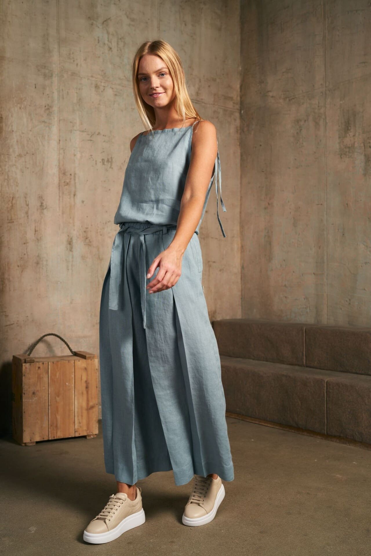 Stilingas per pečius suvarstomas lininis kombinezonas