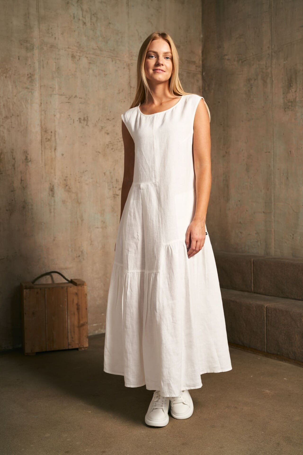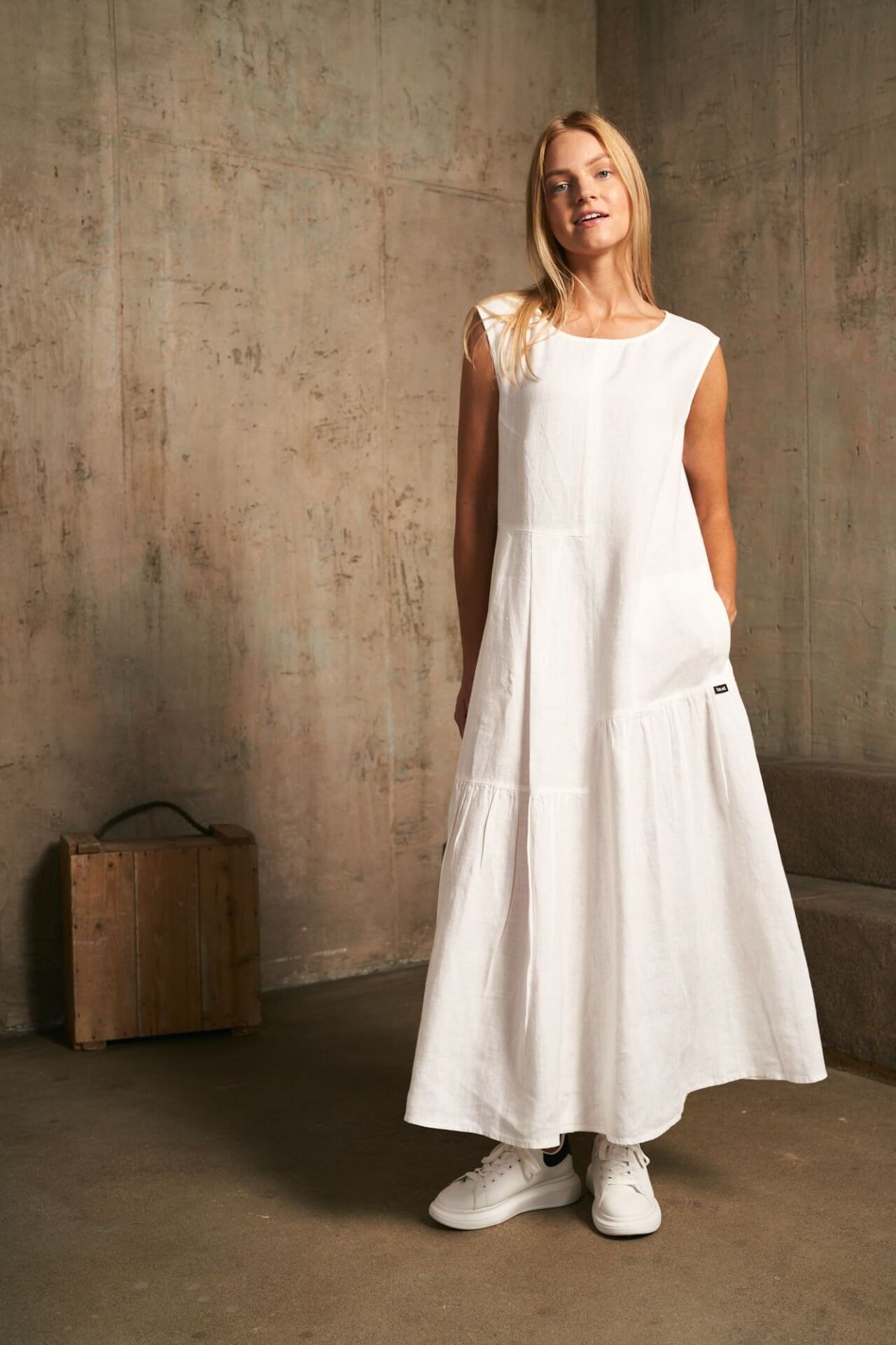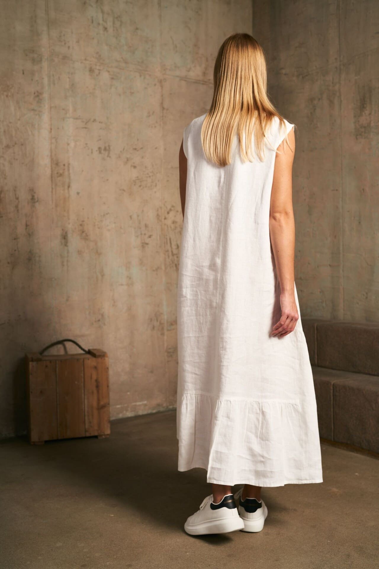 Ilga asimetrinių detalių lininė suknelė.