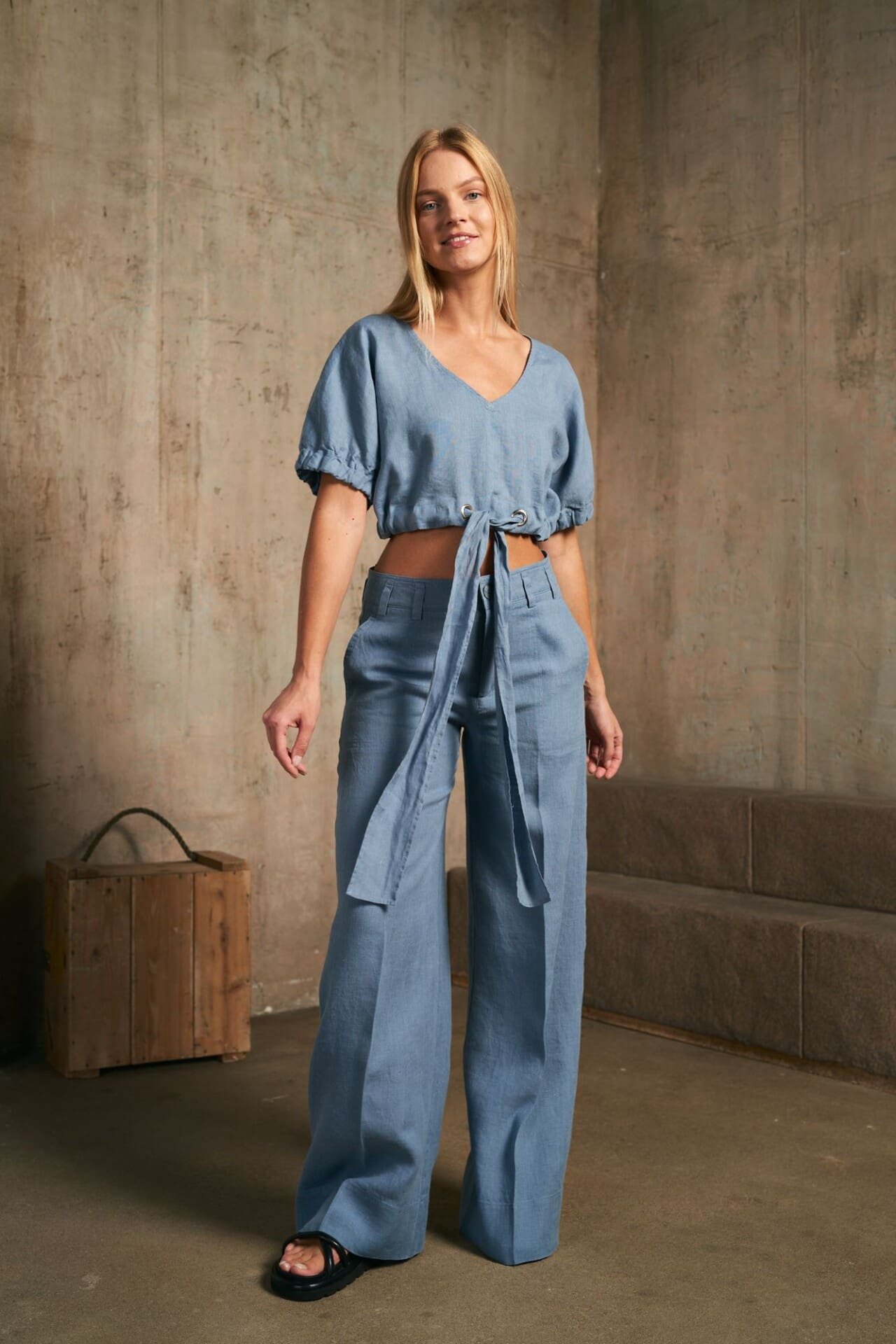 Blue linen trousers in a classic silhouette