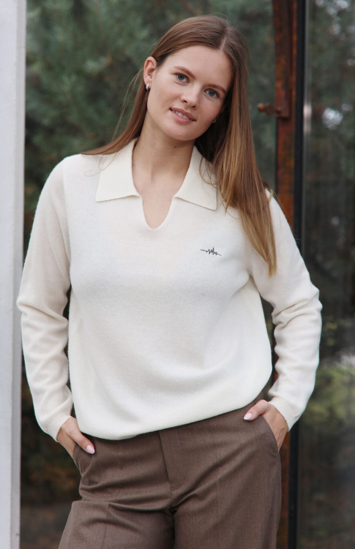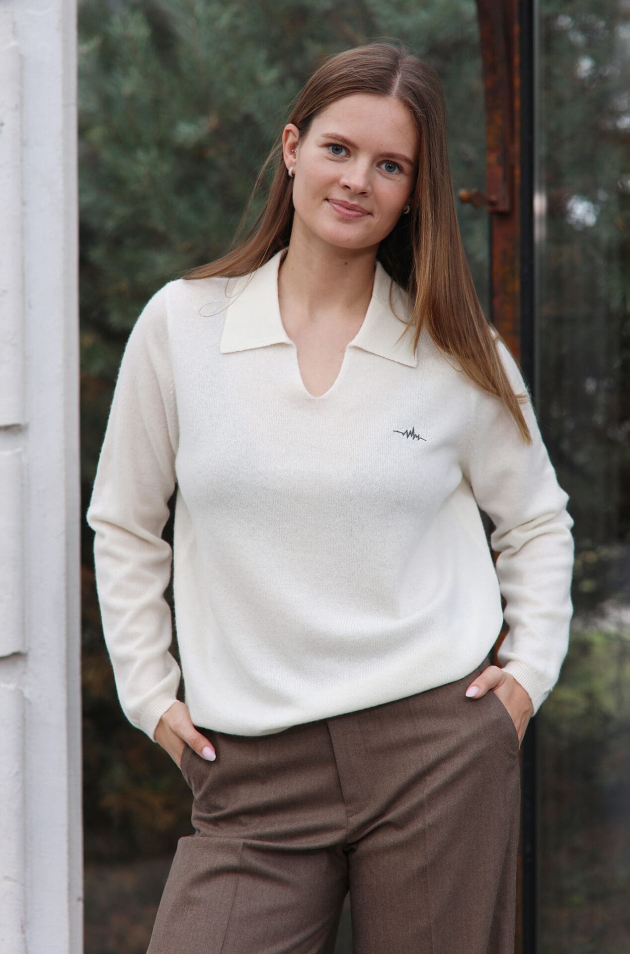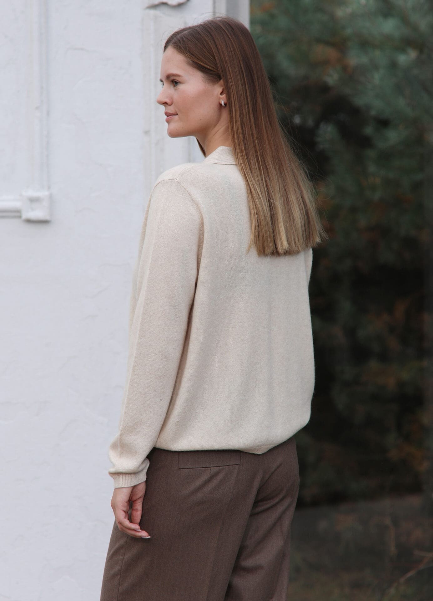 Laisvo silueto kašmyro megztinis su tvarkinga polo apykakle. Šiltas ir stilingas pasirinkimas kasdienai.