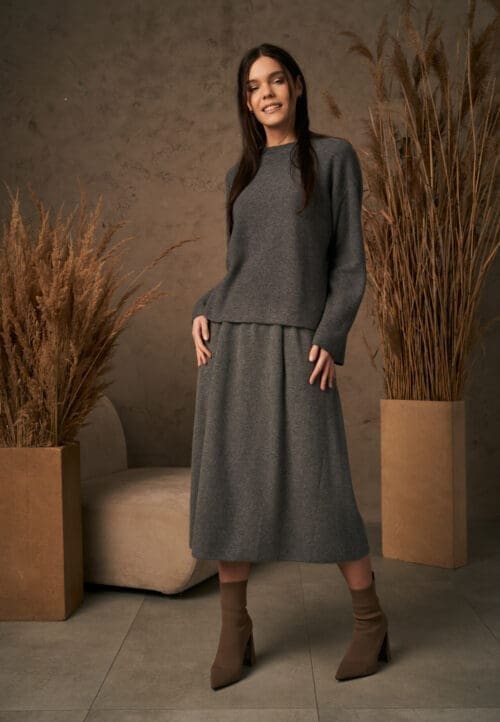 Tiesaus silueto ilga lininė suknelė su stilinga nugaros detale bei skeltukais gaminio šonuose.