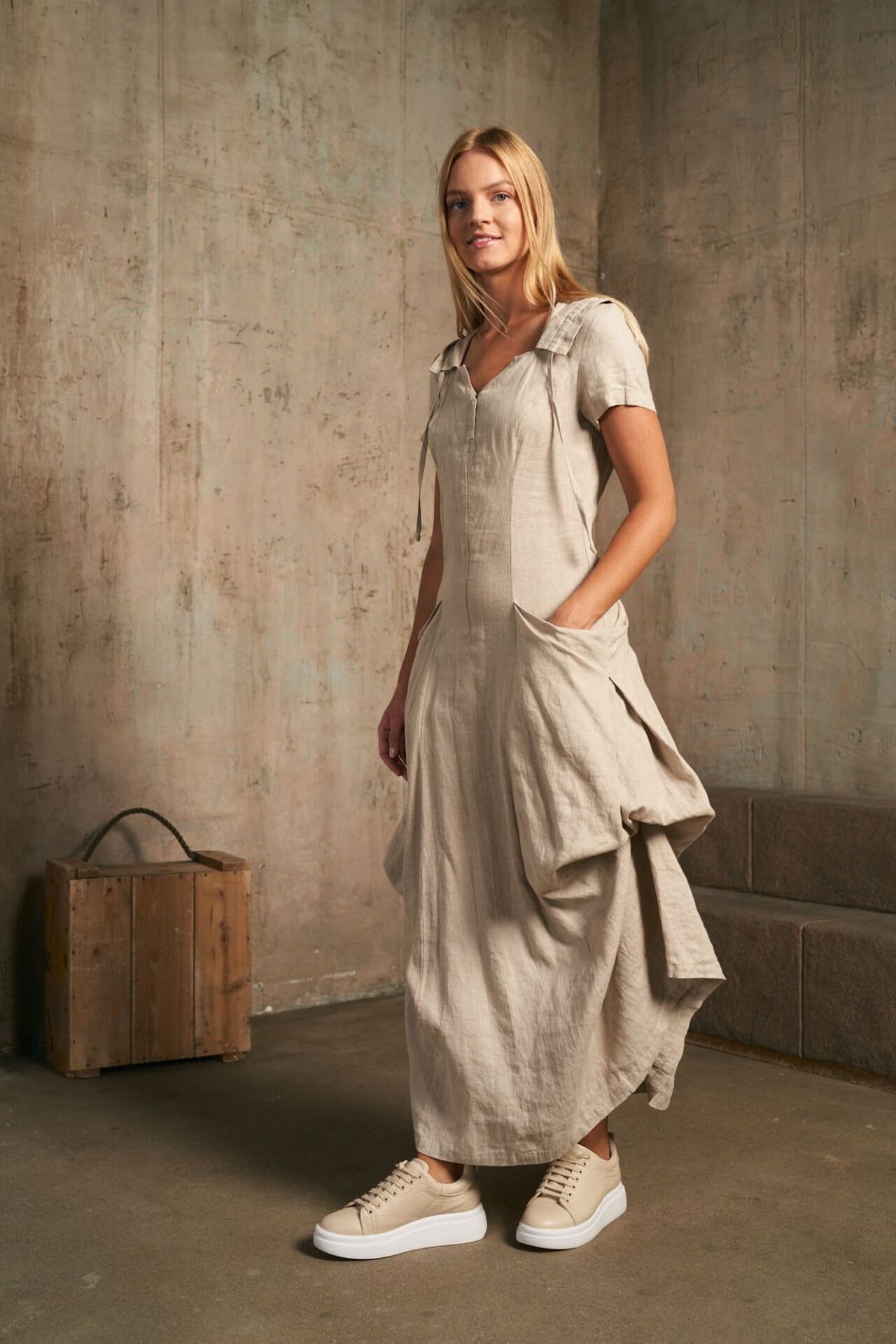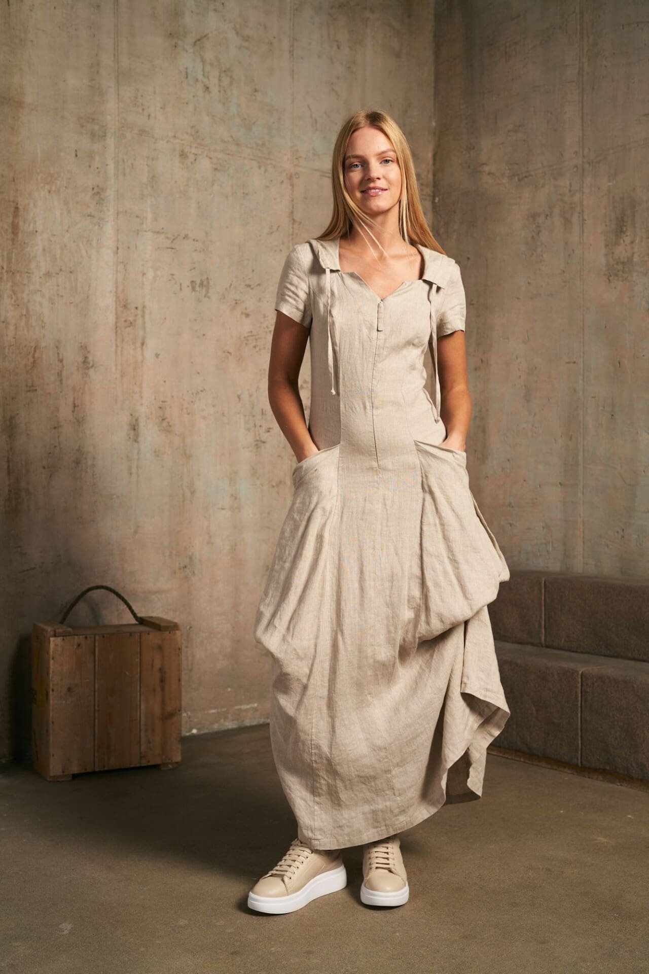 Akcentuojanti moterišką suluetą ilga lininė suknelė. Suknelė turi patogų kapišoną, funkcionalų užsegimą priekyje bei galimybę koreguoti bei asimetriškai reguliuoti gaminio ilgį.