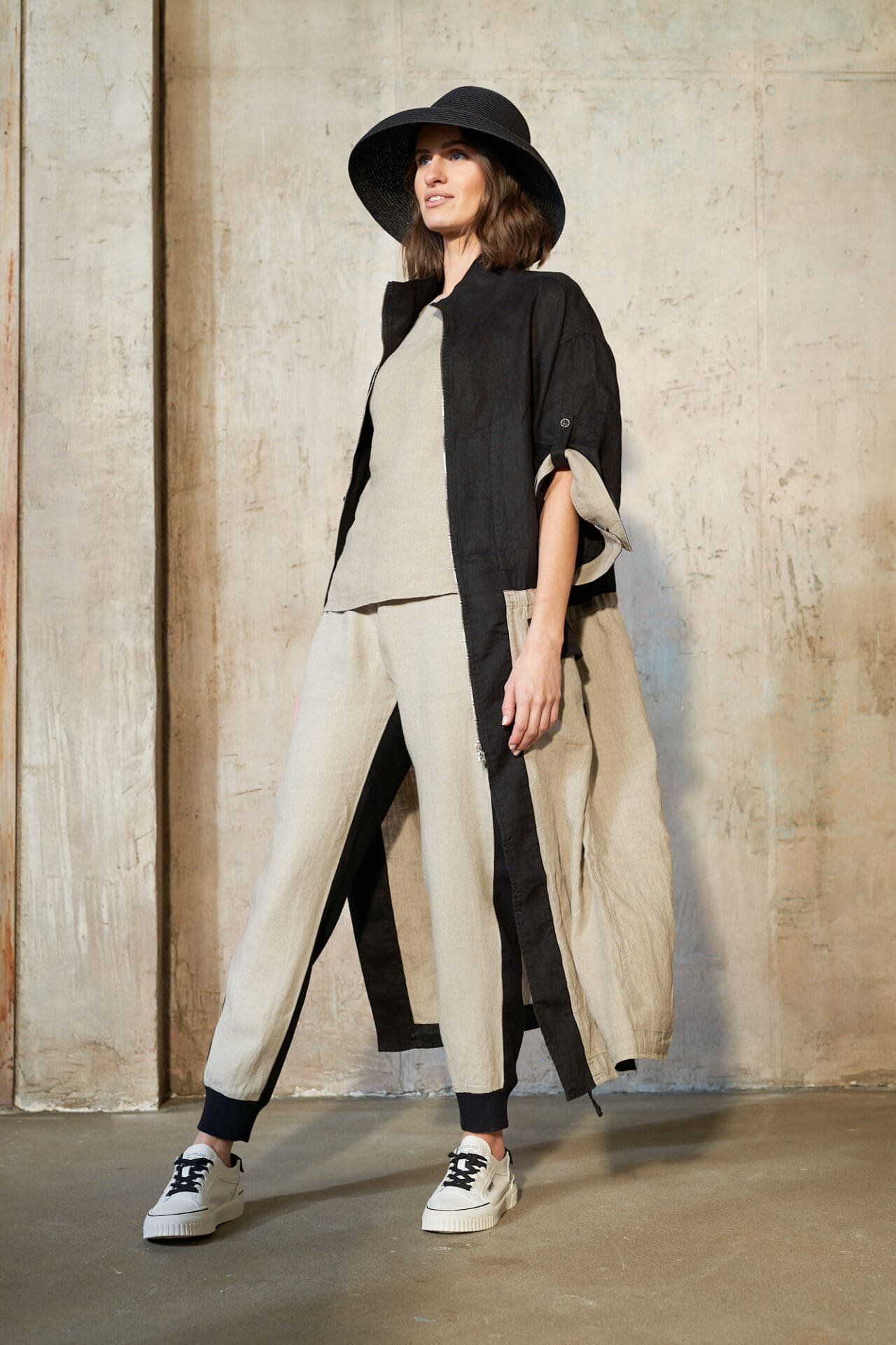 Kontrastuojančios lininės kelnės