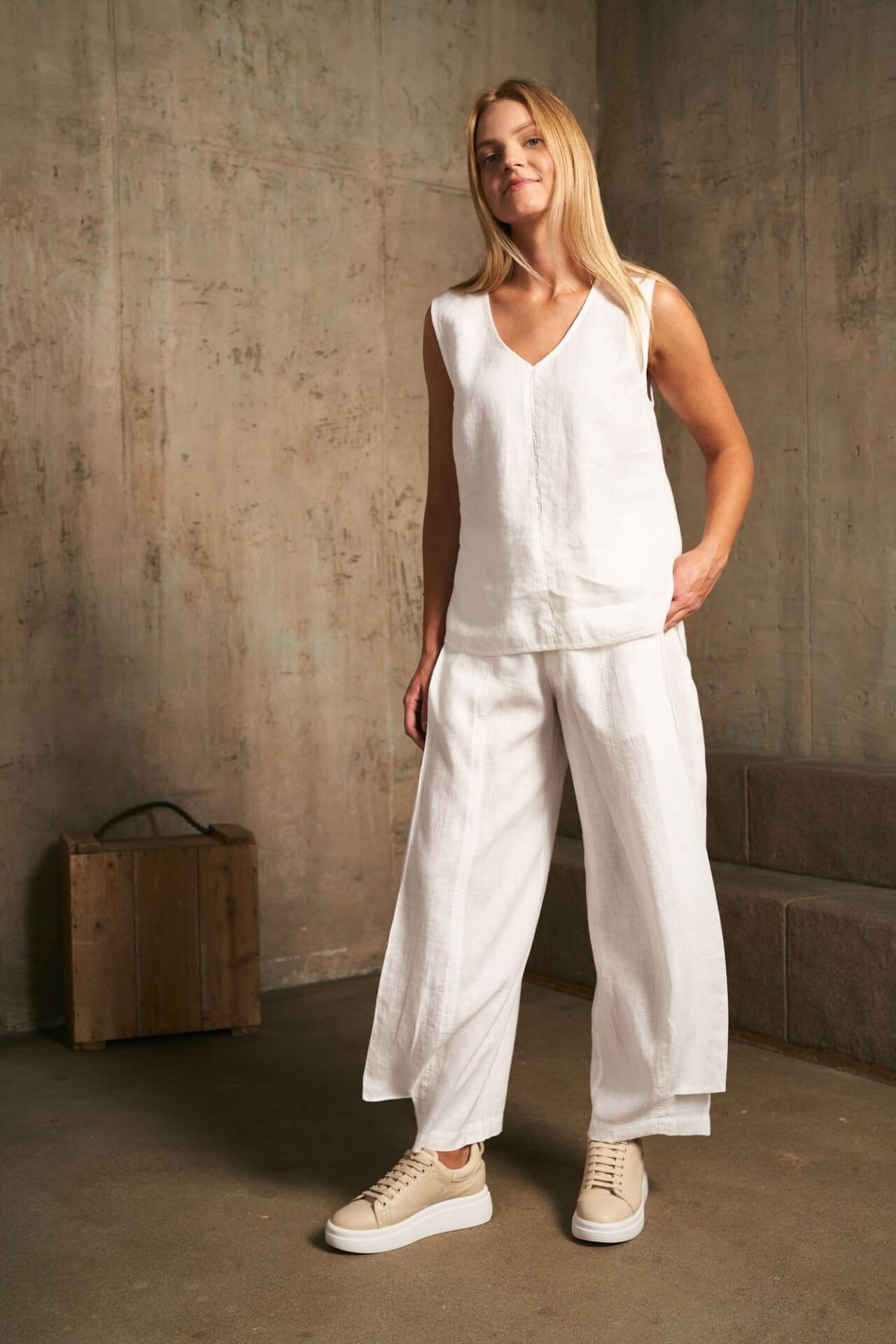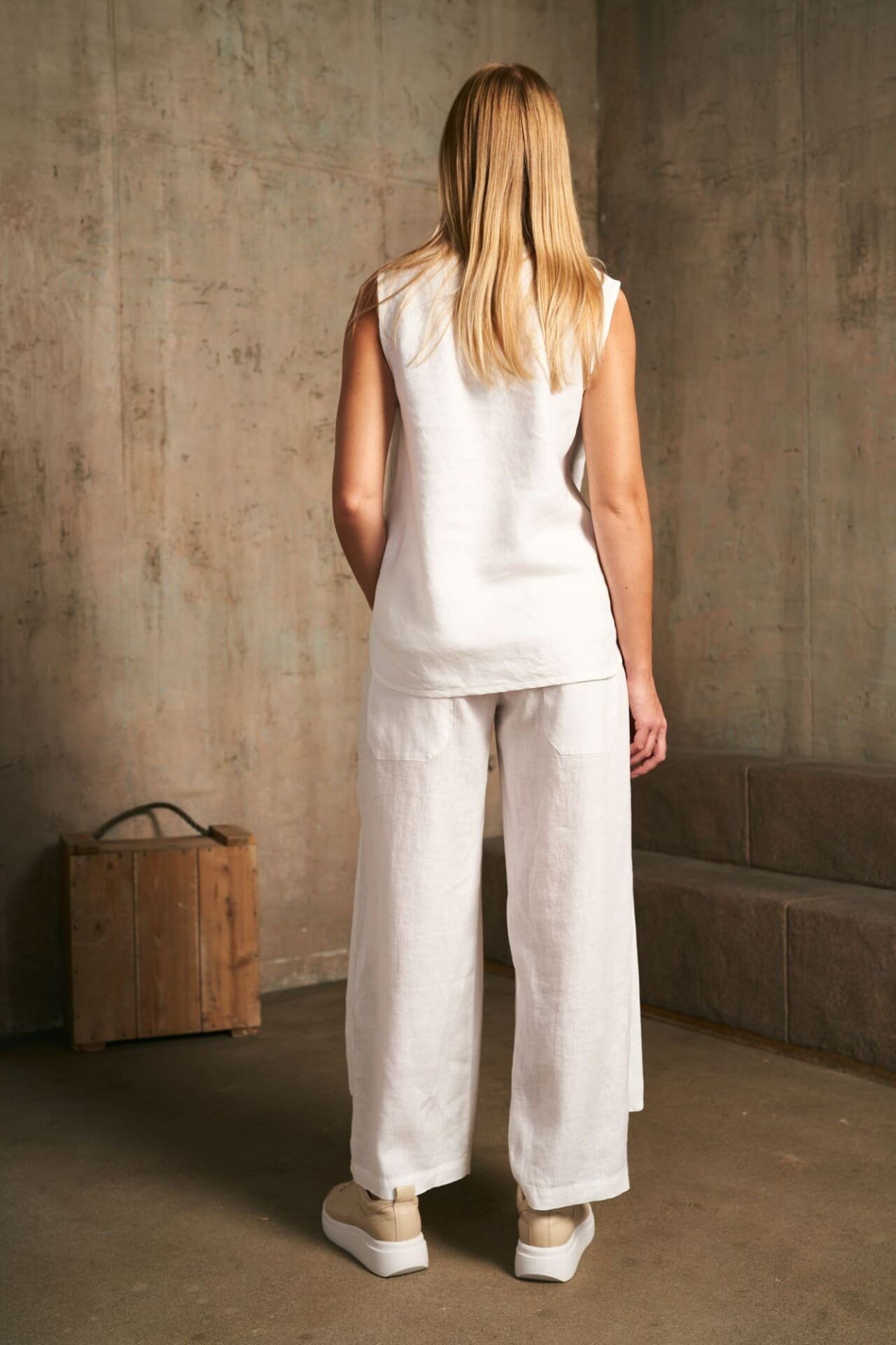 Laisvo silueto lininė palaidinė deranti prie įvairių vasaros įvaizdžių, kurios minimalistinė akcentinė juostelė gaminio priekyje stilizuoja.