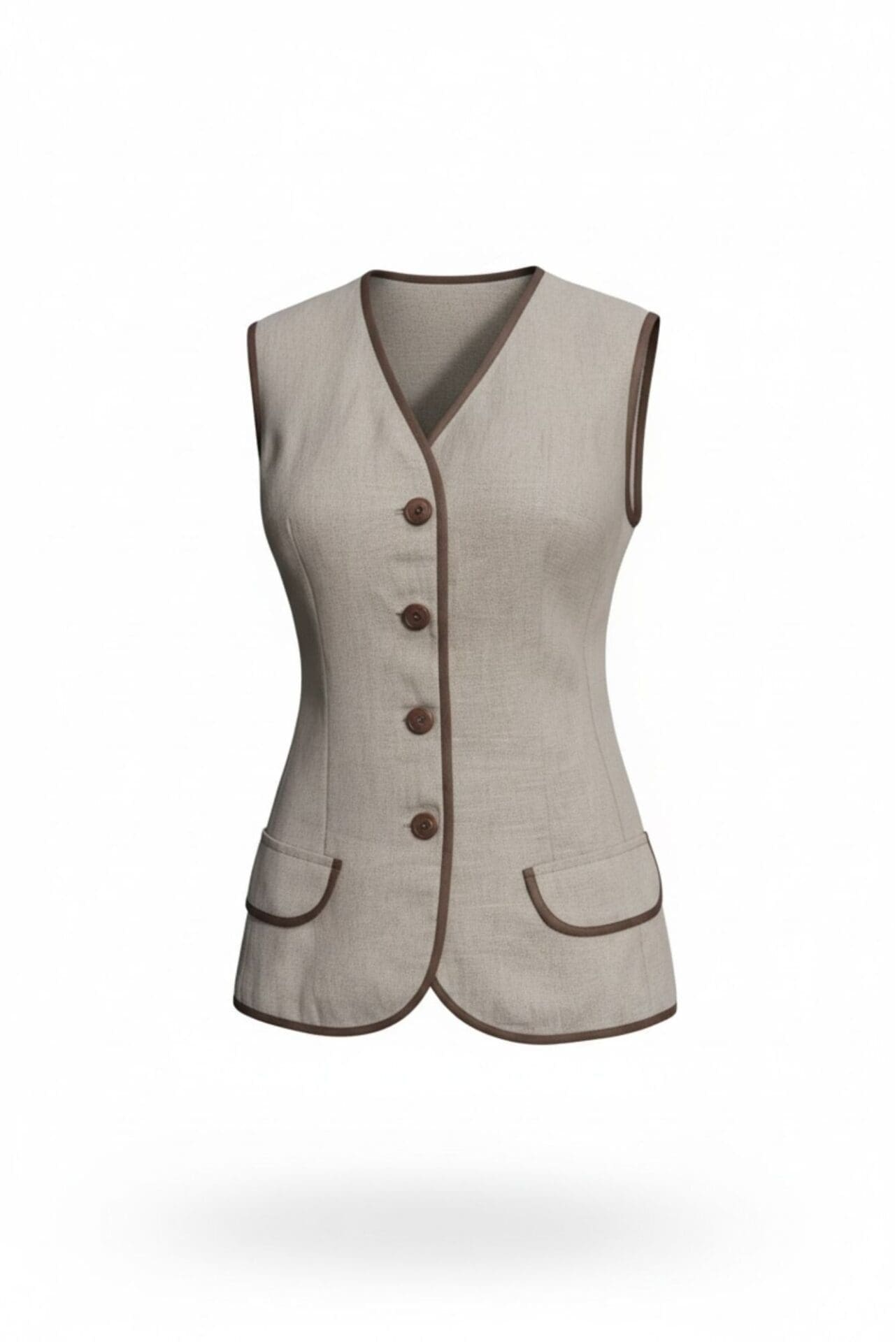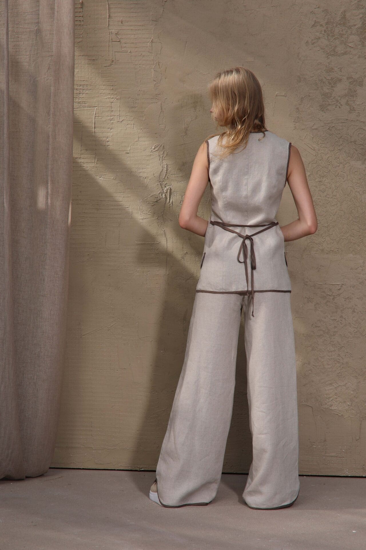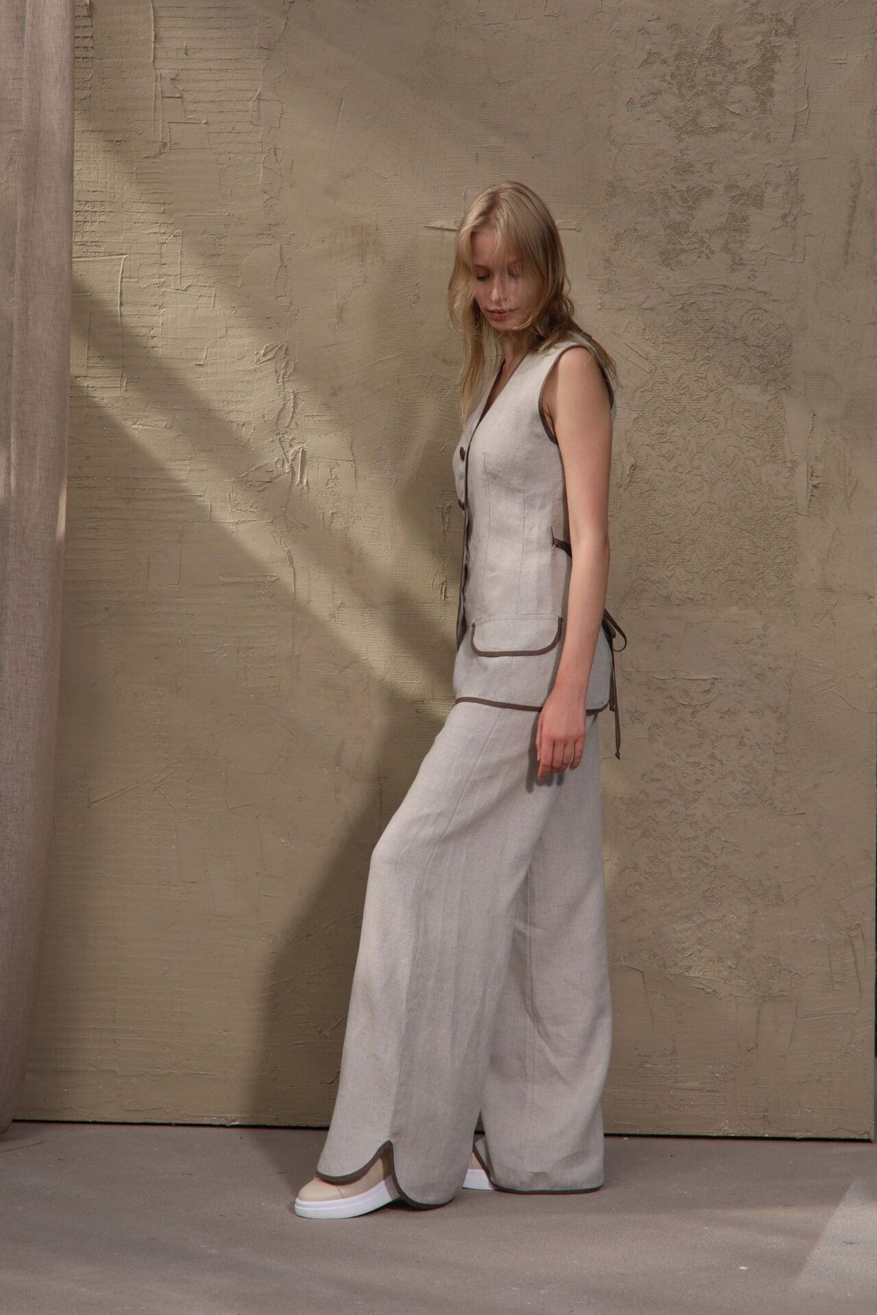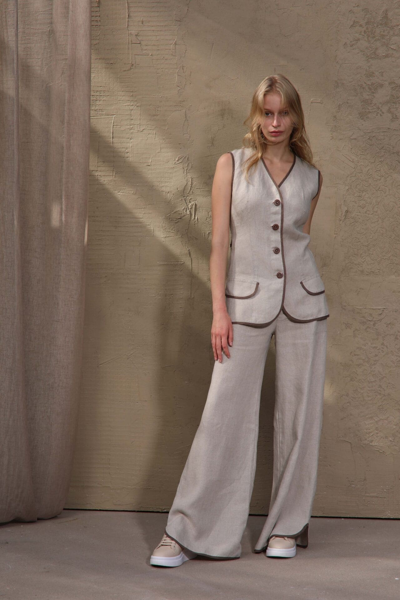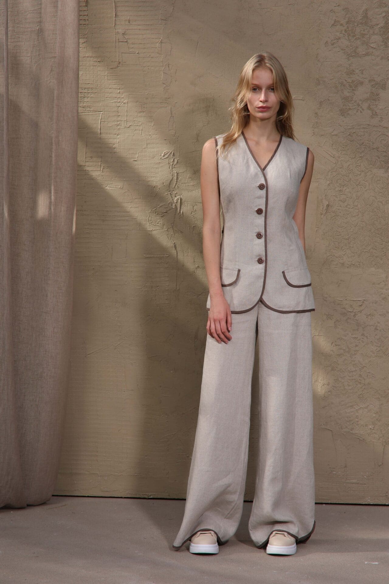 Elegantiška 100 % lino liemenė moterims su liemenuotu prailgintu siluetu. Natūrali lino spalva derinama su Morel spalvos apdaila ir dekoratyvinėmis kišenėmis.Elegantiška ir moderni 100 % natūralaus lino liemenė, sukurta moterims, vertinančioms natūralumą, komfortą ir subtilų dizainą. Prailgintas, liemenuotas siluetas gražiai pabrėžia figūrą, o kontrastinga Morel spalvos apdaila suteikia išskirtinumo. Liemenė užsegama keturiomis sagomis ir dekoruota subtiliomis kišenėmis su apdaila. Natūrali lino spalva sukuria lengvą, vasarišką įvaizdį, o kvėpuojantis audinys leidžia jaustis patogiai net itin šiltomis dienomis.