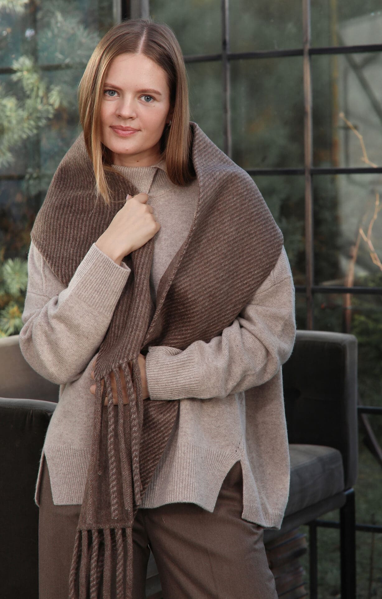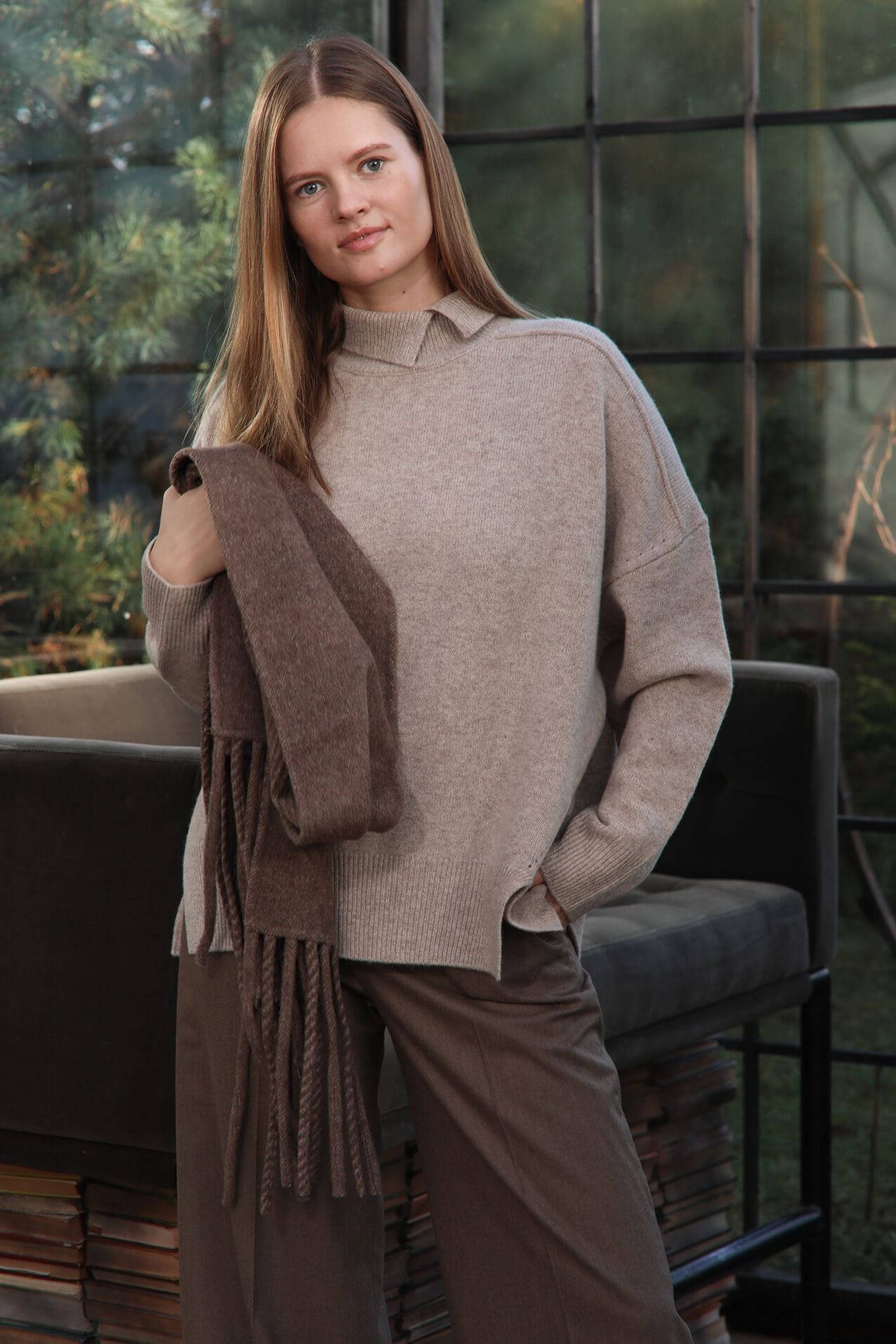 Oversize tipo kašmyro megztinis, su dekoratyve detale kaklo zonoje. Lengvai krintantis laisvesnio silueto – patogus ir subtilus pasirinkimas kasdienai.