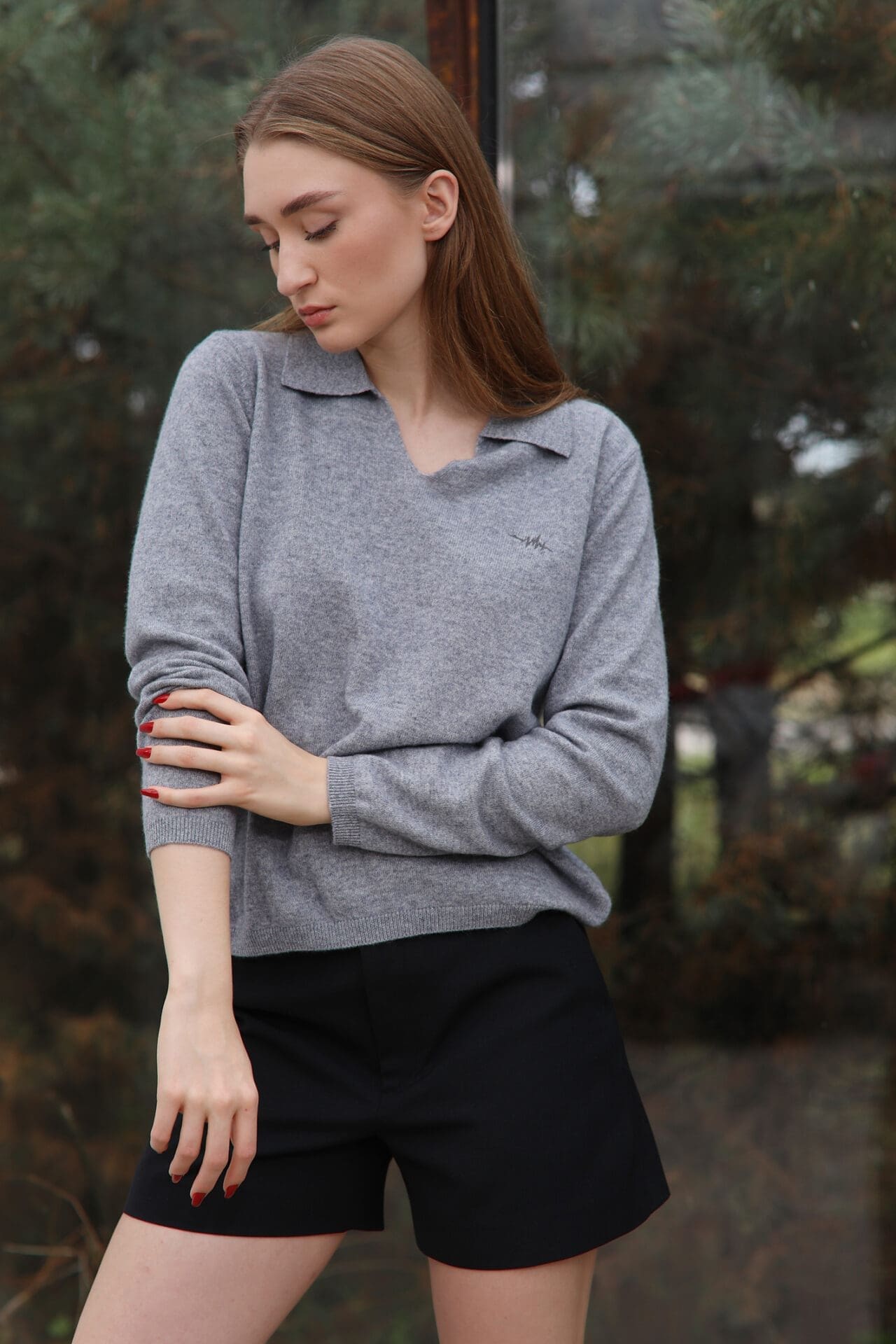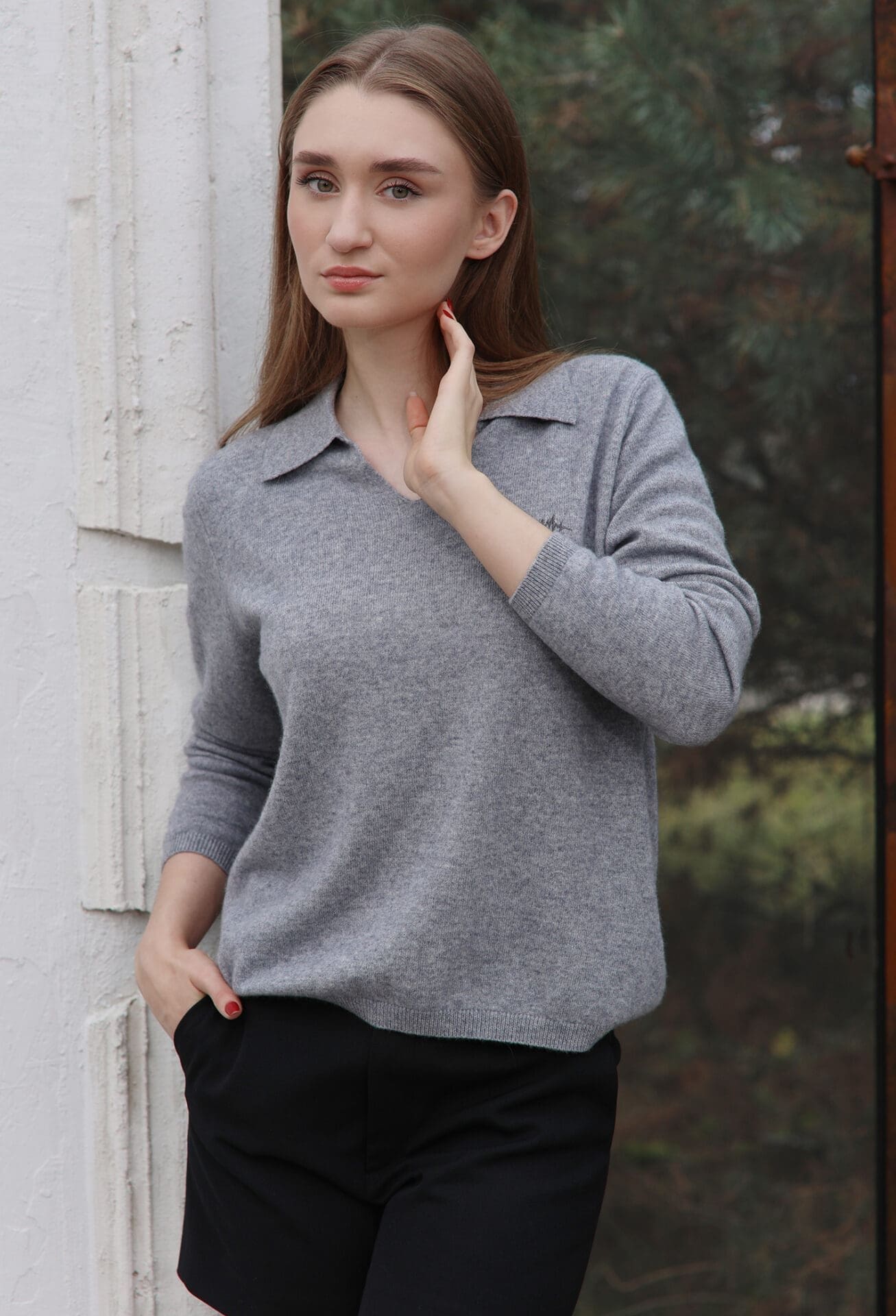 Laisvo silueto kašmyro megztinis su tvarkinga polo apykakle. Šiltas ir stilingas pasirinkimas kasdienai.