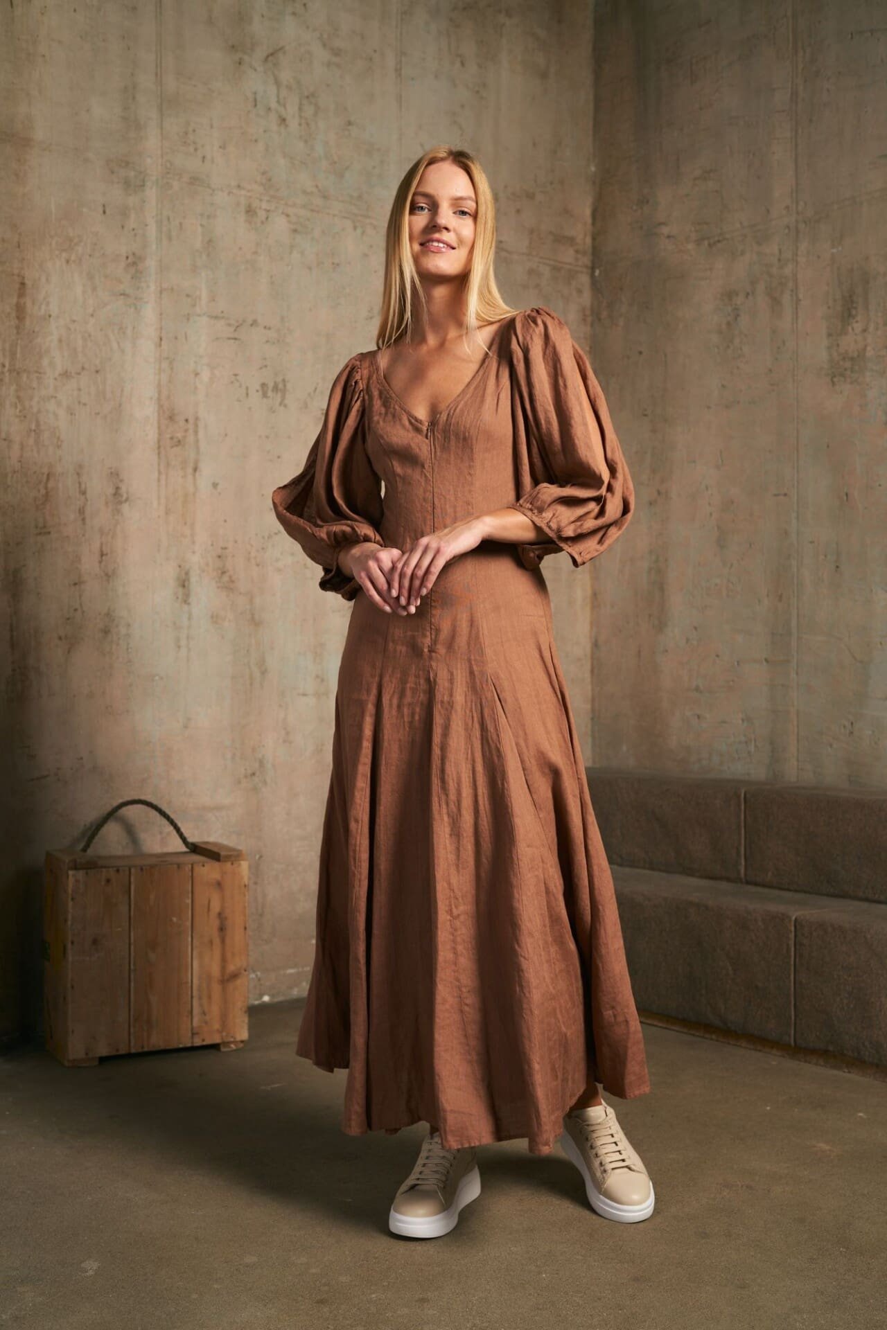 Išskirtinė įliemenuoto silueto ir pūstų rankovių lininė suknelė. Maxi ilgio.