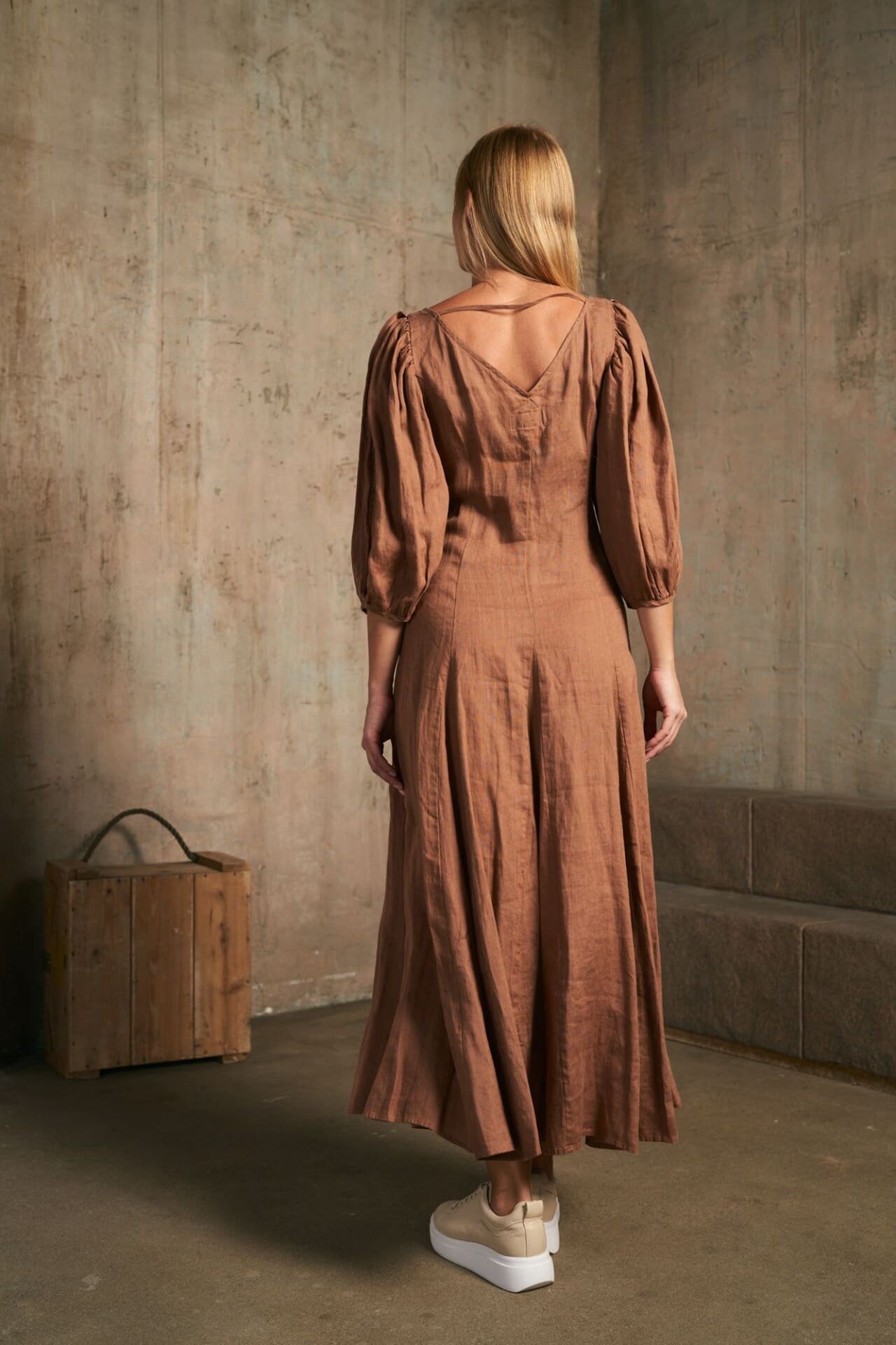 – Ilga liemenuota lininė suknelė