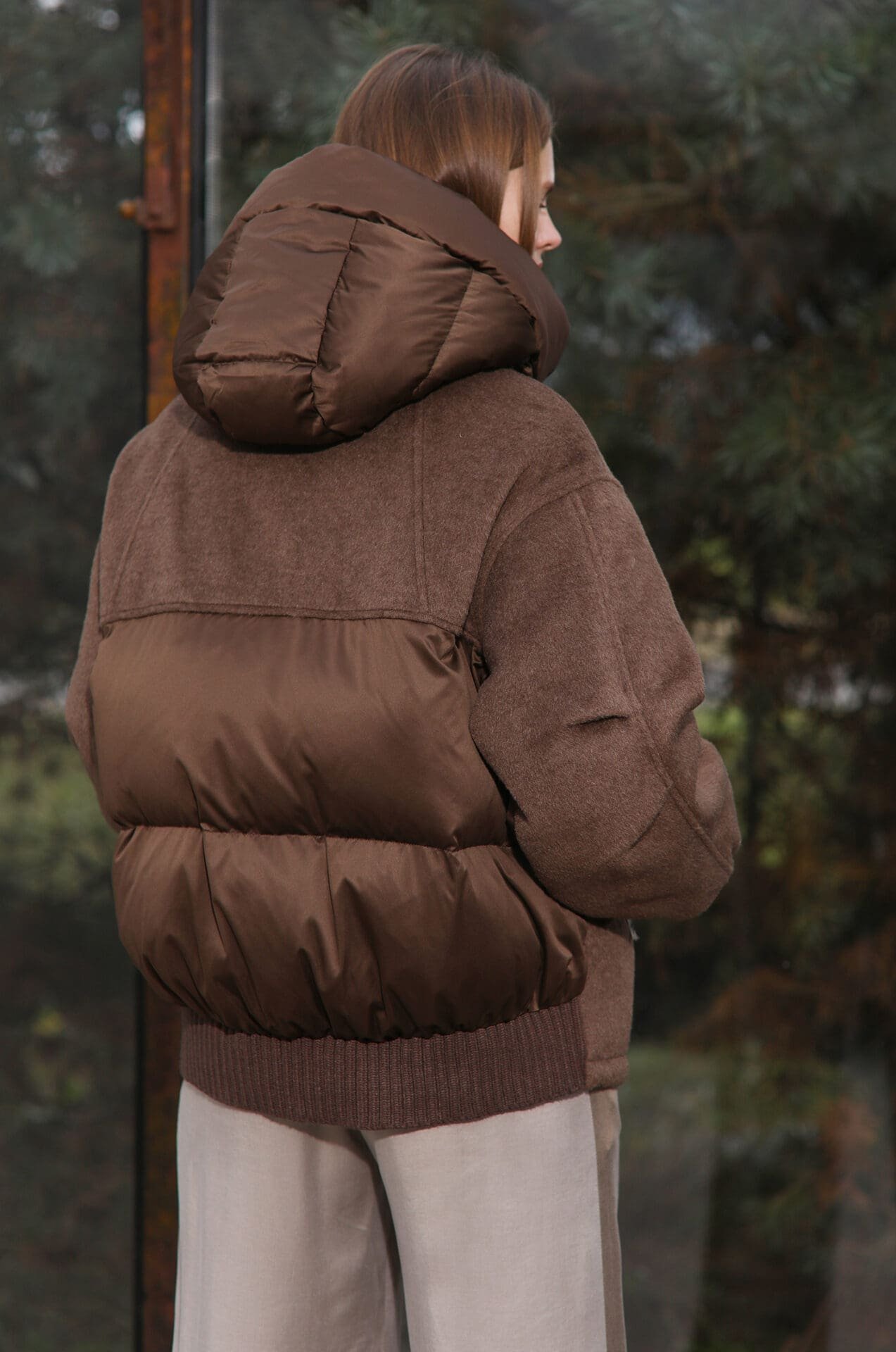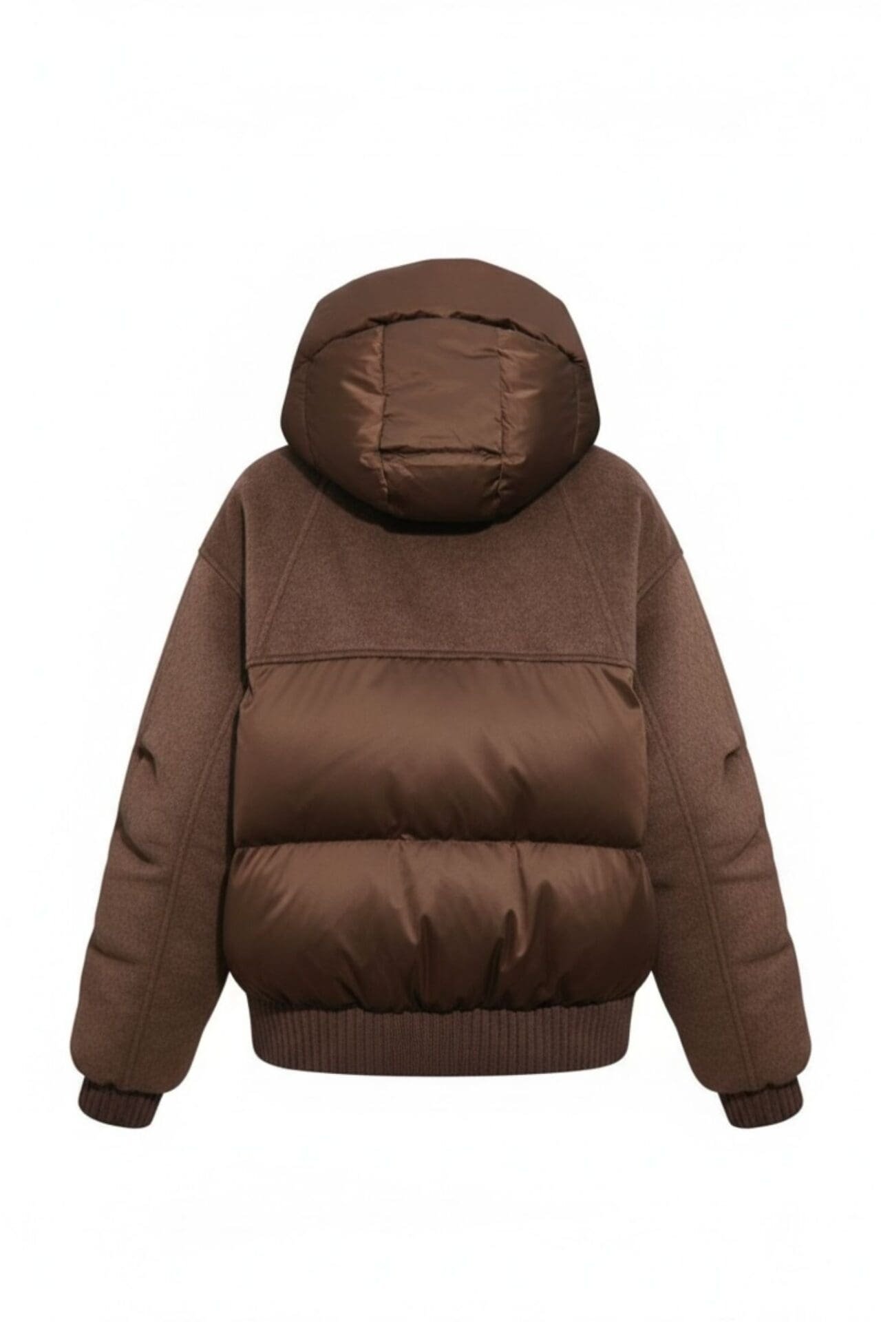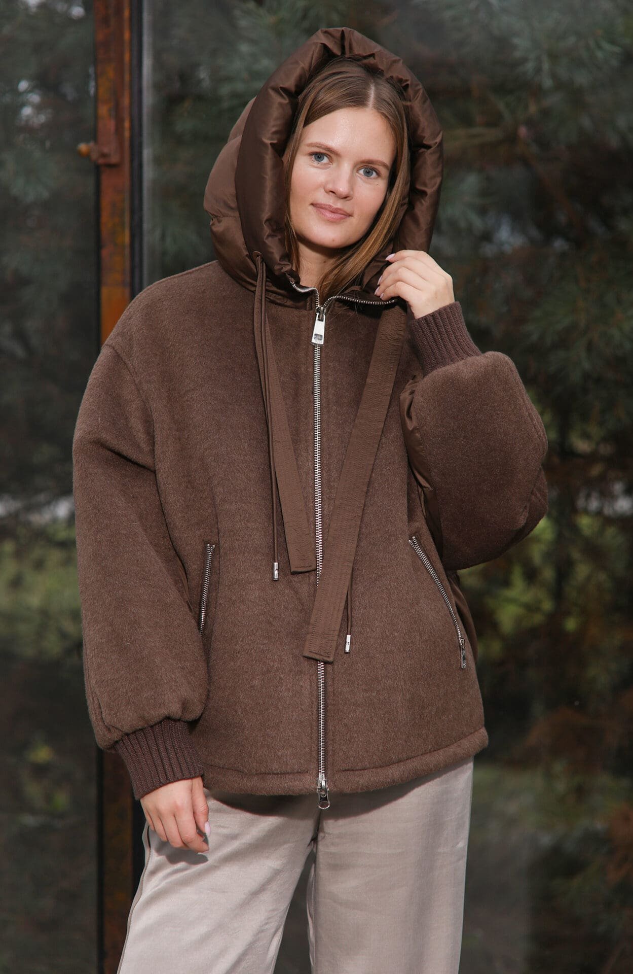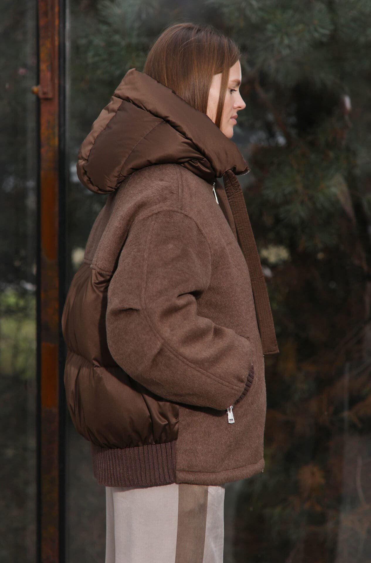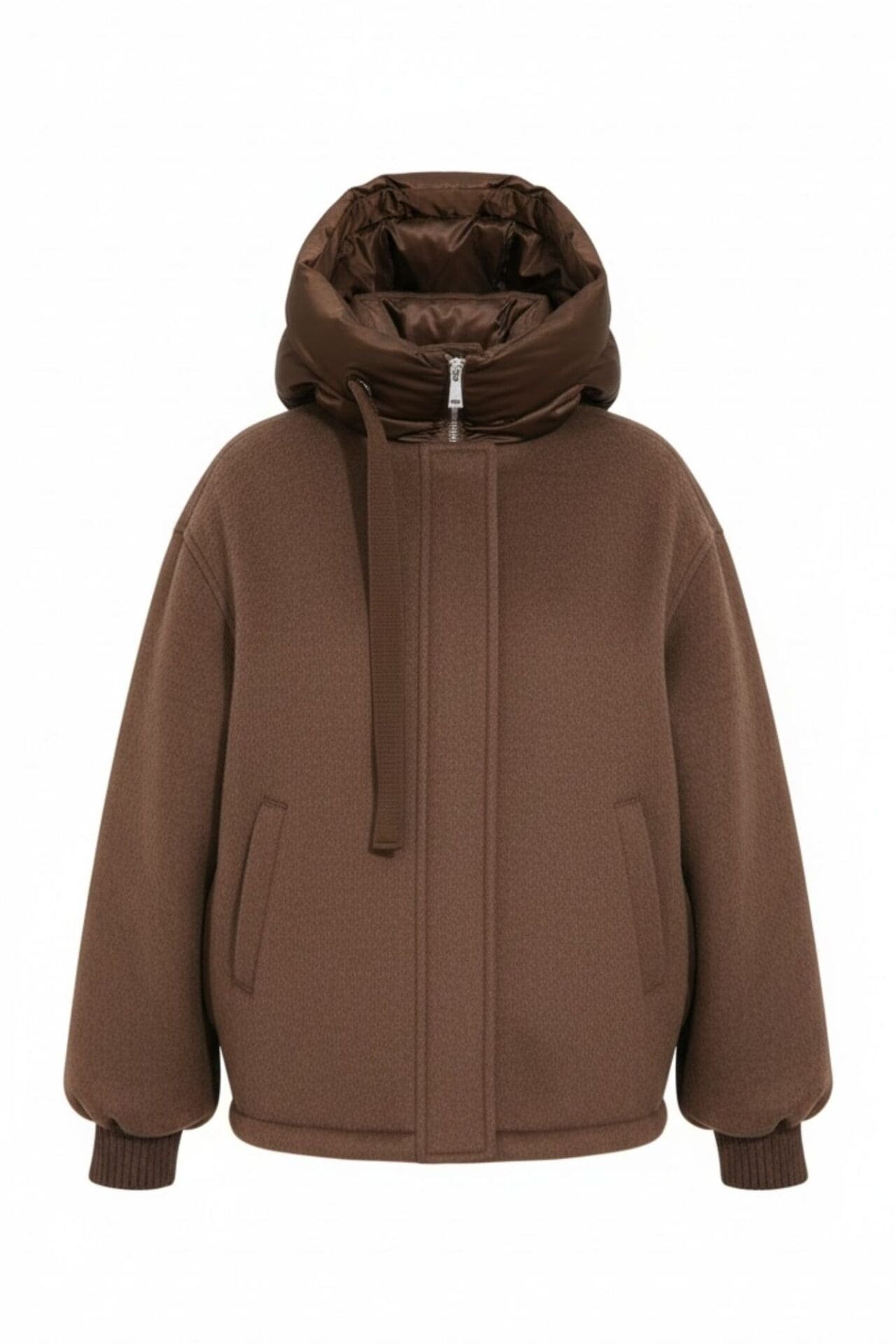 Labai modernus, minimalistinis, šiek tiek „urban“ bei „luxury casual“ įvaizdis. Plati, laisvai krentanti, oversize tipo striukė-paltas, suteikianti komfortišką ir lengvai sluoksniuojamą siluetą. Pagrindinė dalis vilnos tipo audinio, suteikiančio paltišką, struktūruotą įvaizdį, o nugarinė dalis ir kapišonas – iš pūstos, paminkštintos medžiagos, panašios į puffer tipo striukes. Tai sukuria kontrastą tarp tekstūrų ir suteikia papildomos šilumos.